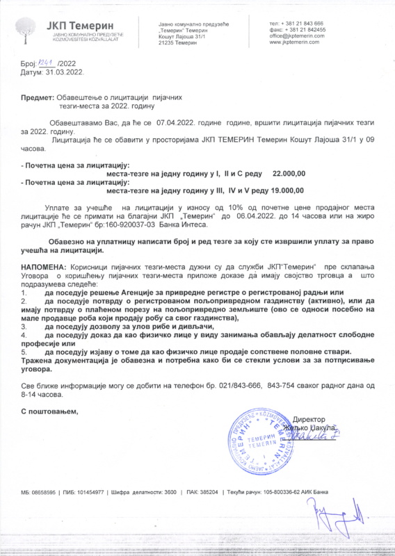 Обавештење о лицитацији пијачних места-тезги за 2022 годину